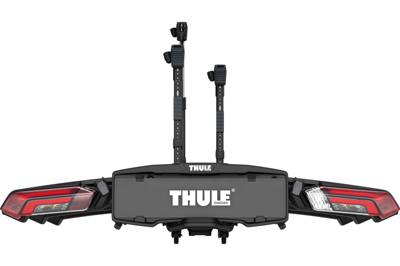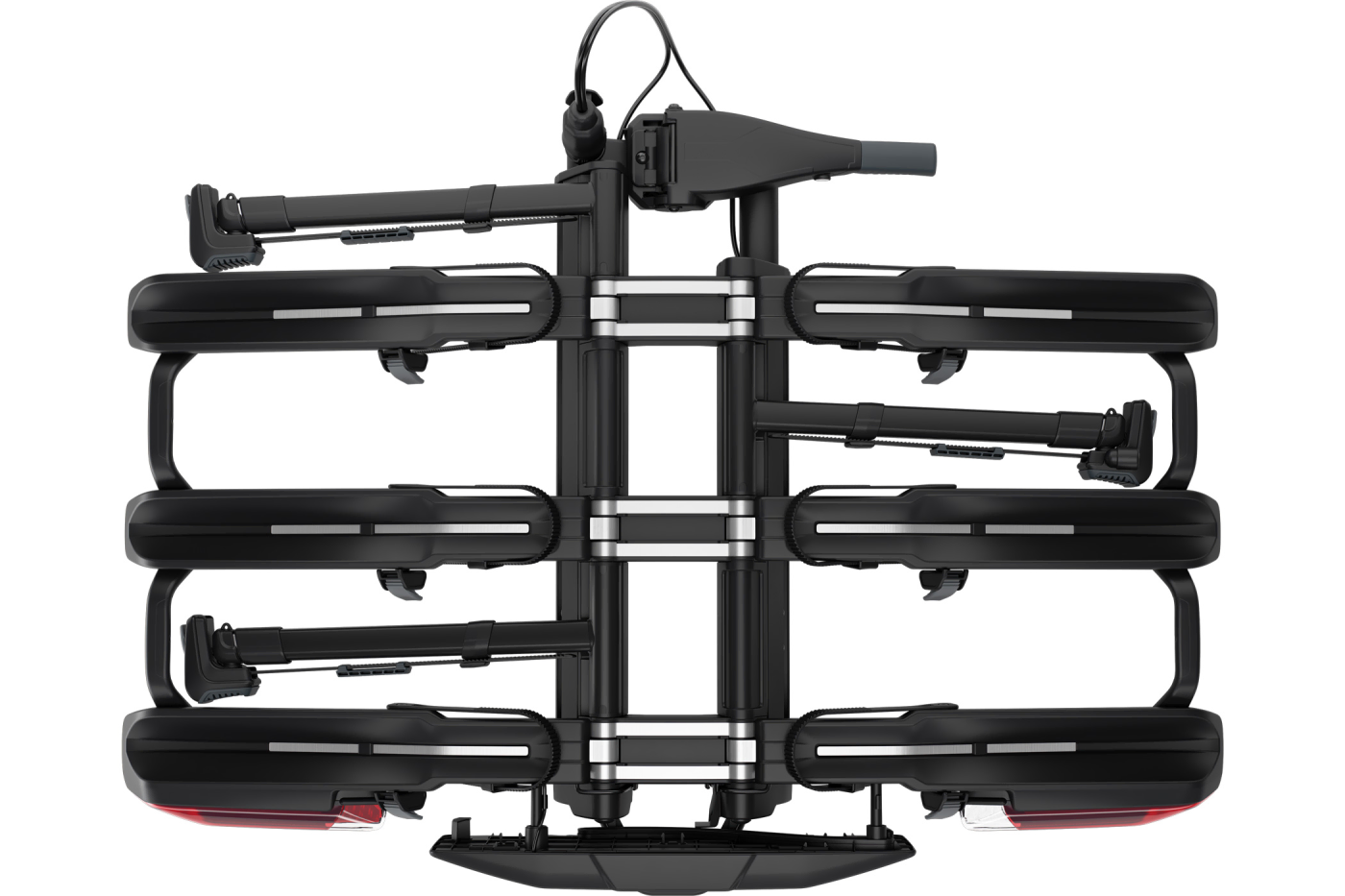 The design provides 25 cm spacing between bikes to help reduce contact during transport. Extra-long wheel holders support bikes with wheelbases up to 1350 mm, while ratcheting pump buckles and wheel straps secure tires up to 3.2″ (or up to 5″ with a separately sold accessory). A foot-pedal tilt mechanism allows access to the vehicle’s boot while bikes are mounted, while the boot can be accessed without tilting when the rack is unloaded.