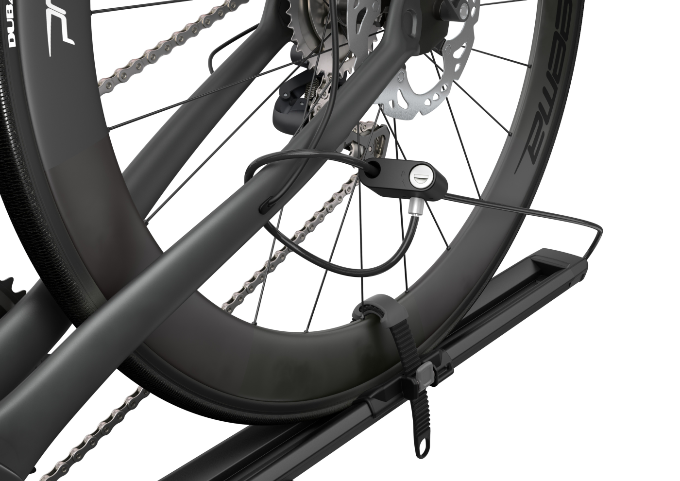 The included fork adapters are fitted to your bike before mounting, 9-15mm Thru Axle and 9mm Acu-Tight quick release adapters, are supplied as standard, an adapter for 20x110mm Thru Axles is Sold Separately. This Axle Adapter fits into a guide track clicking into the carrier and revealing a green indicator on the lever lock when secured in place. A rear wheel strap with quick release pump buckles holds the back wheel securely in place. A rear mounted security cable lock is ideal for locking your bike to the bike carrier.