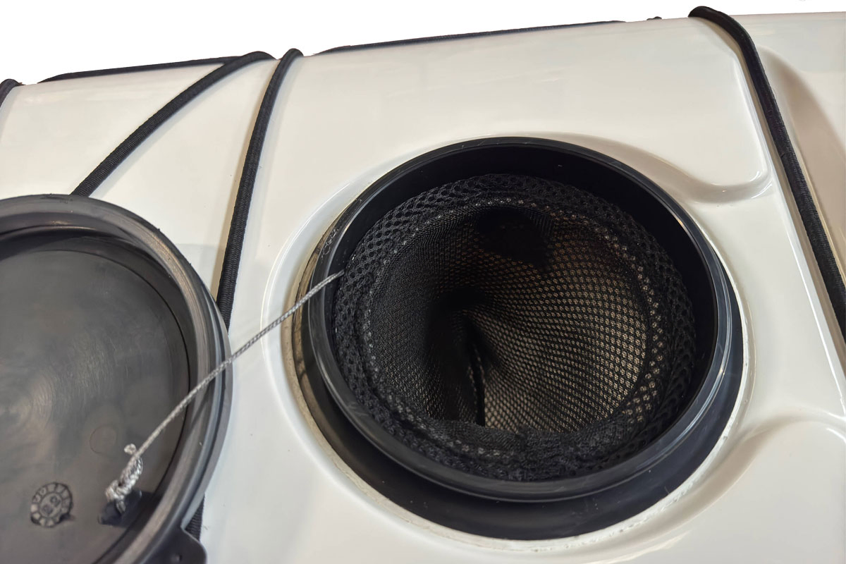 There are three bulkheads, two of which are accessed by good-sized oval hatches for packing larger equipment. The third smaller day hatch bulkhead behind the cockpit can easily be accessed while on the water and is useful for storing wet weather clothes close to hand in case of brisk winds and showers. There is also room for any cooking kit and food you might need for a break on a beach during a trip. A fourth small hatch in front of the cockpit which gives access to a mesh bag ideal for stowing snacks, a cap or any other bits and bobs you need while paddling.