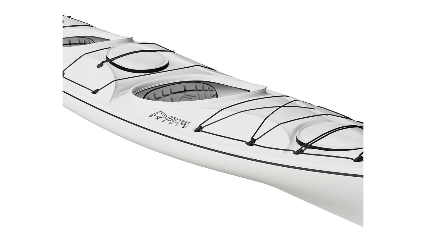 The Delta Traverse 17.5 T With Rudder is a lightweight tandem touring kayak that features two separate cockpits both of which are well sized for a range of paddler sizes and can also take a spraydeck. Constructed from Delta’s thermoformed plastic, this tandem touring kayak is both lightweight and highly durable. Thermoformed plastic offers impact resistance, stiffness for better performance than other plastic kayaks and UV stability, making it take most of the great features that composite kayak offer while remaining more affordable, durable and easier to maintain. The lightweight nature of this Delta Kayak makes it more manageable to lift, load and portage, which is sure to keep everyone much happier. It's sleek finish not only looks amazing but on the water this slick finish enables a better glide through the water.